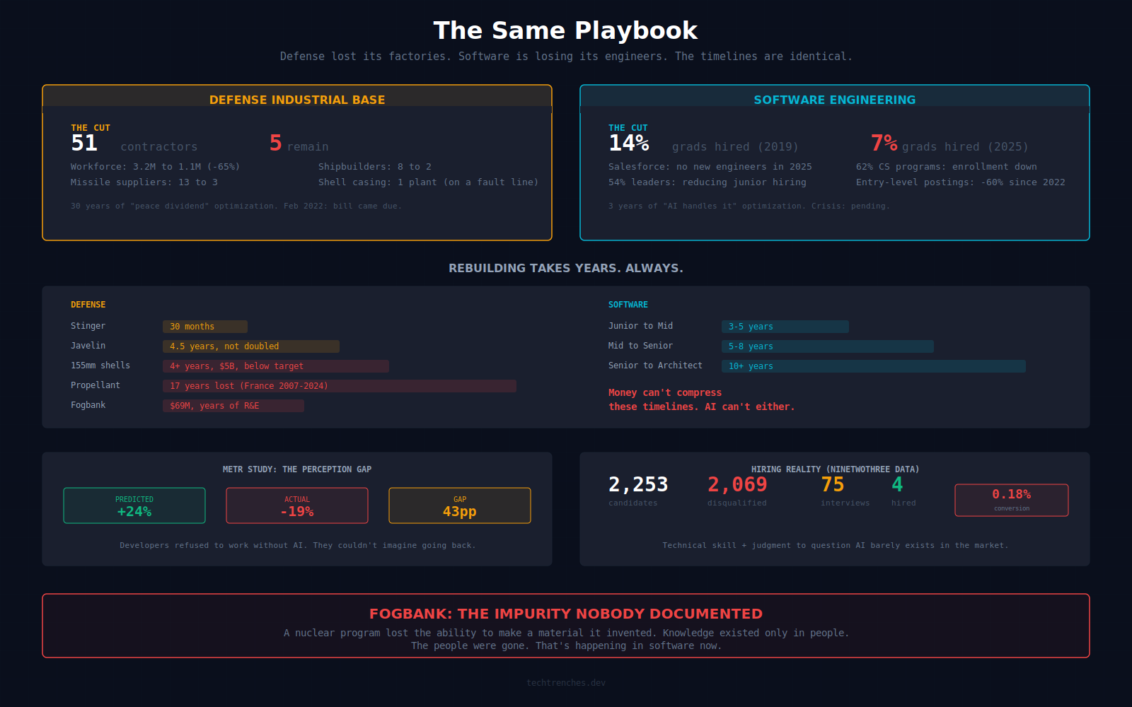 I know how this sounds. I know I’ve written about the talent pipeline before. The defense example isn’t about repeating the argument. It’s about showing what happens if the industry’s expectations don’t work out. Stinger, Javelin, Fogbank, a million shells nobody could make. That’s the cost of betting wrong on optimization. We’re making the same bet with software engineering right now.