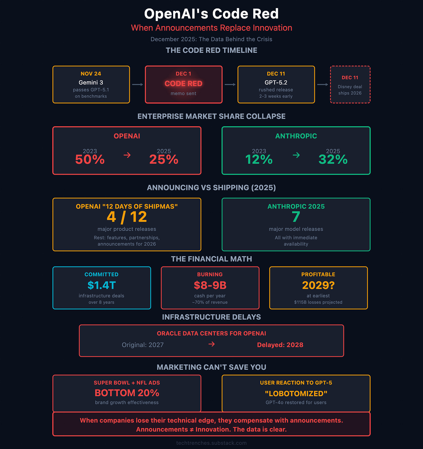 OpenAI entered December 2025 in reactive mode. Responding to competitive threats with rushed releases and high-profile partnerships. Enterprise market share halved. Users preferring old models. A $207 billion hole to fill before profitability.
