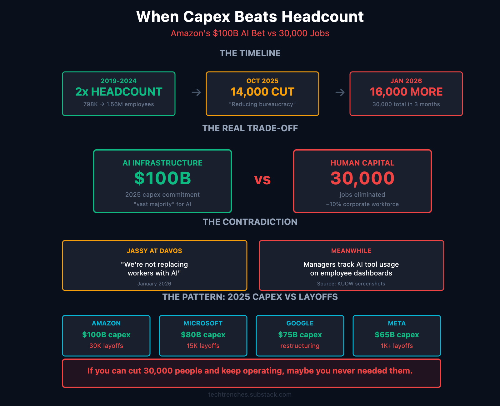 Amazon committed $100 billion in capex for 2025. The “vast majority” goes to AI infrastructure. Meanwhile, 30,000 people are gone.