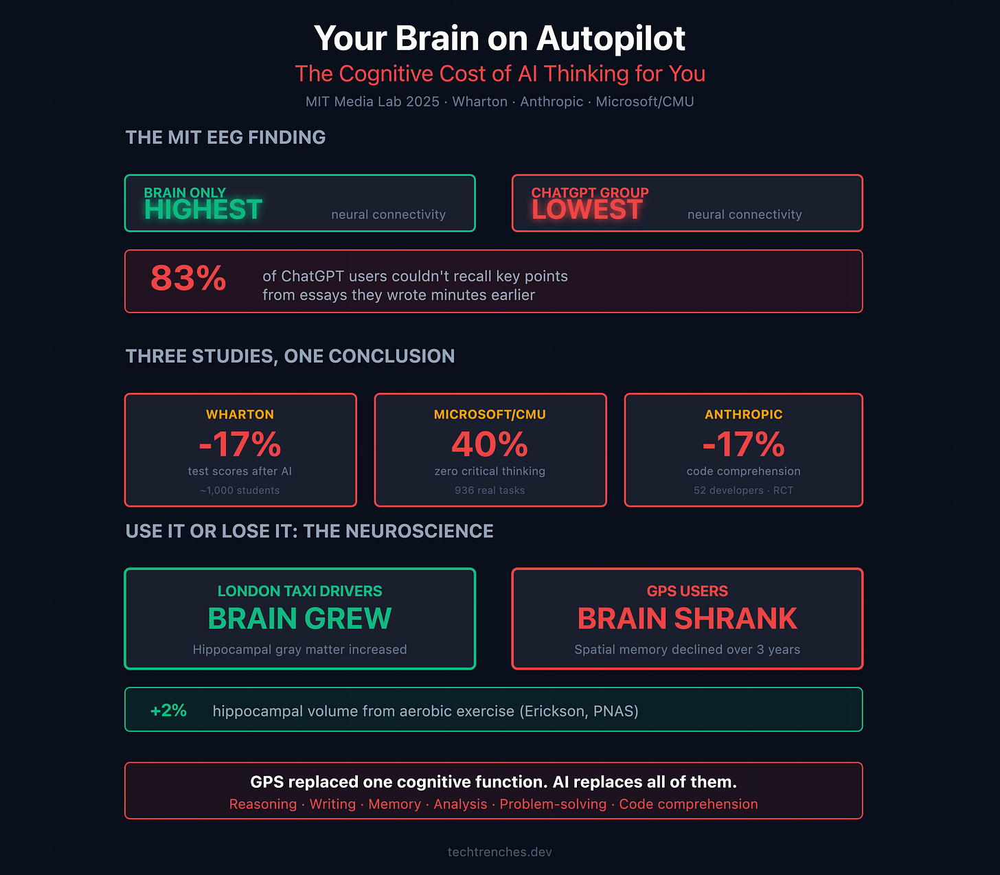 GPS replaced one cognitive function. AI touches reasoning, writing, memory, analysis, problem-solving, and code comprehension simultaneously. All at once. Every day.